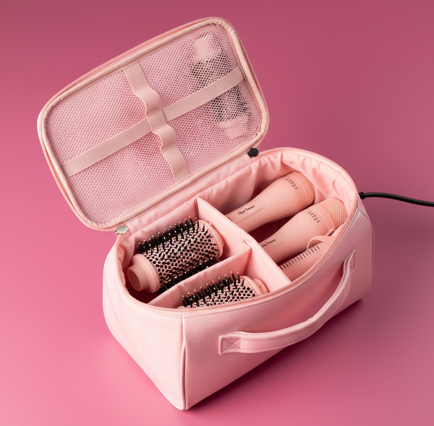One power base. Four expert heads. Big volume, sleek shine, effortless curls - all in one stunning pink vanity case.